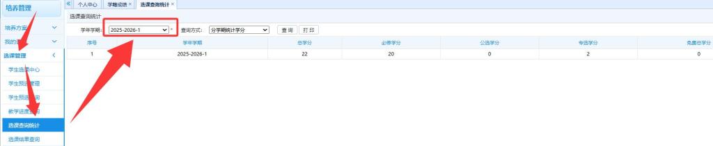 查询方式:学生登录教务管理系统,在“培养管理”→“选课管理”→“选课查询统计”→“学年学期”选择2025-2026-1→“查询方式”选择“分学期统计学分”→查询到本人的当学期的学分数据。在“分学期统计课程”和“选课结果查询”中都可以查到对应学期所修课程。
